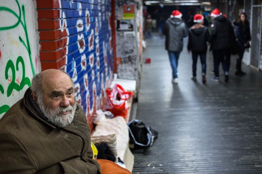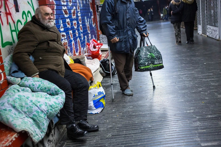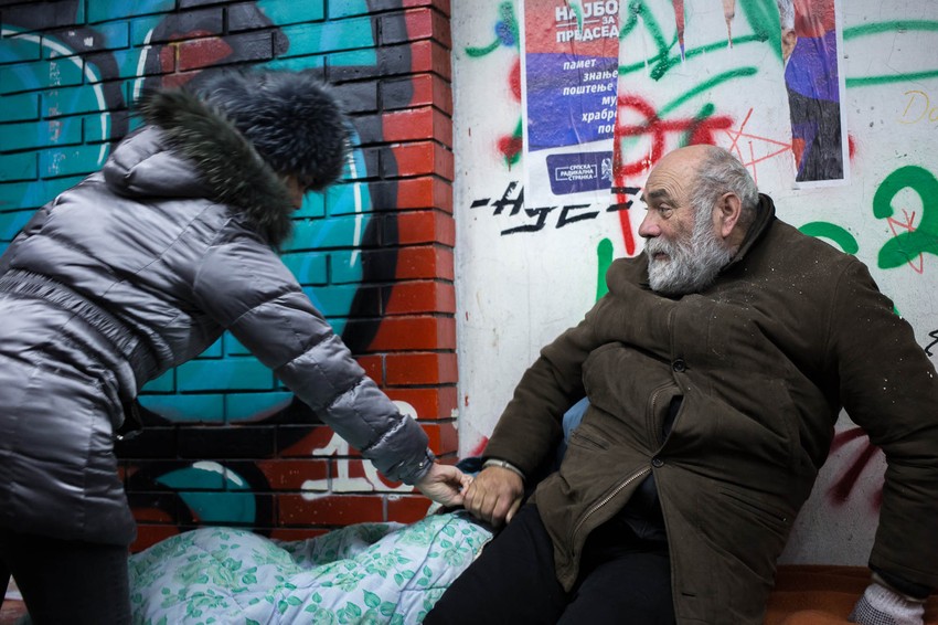 Među njima je jedan stariji gospodin koji, uvijen u jorgan, leži na improvizovanom krevetu od kartona dok mu se pogled gubi u daljini. Kaže da razmišlja o svemu što mu se desilo u životu što mu teže pada nego kad je stomak prazan.