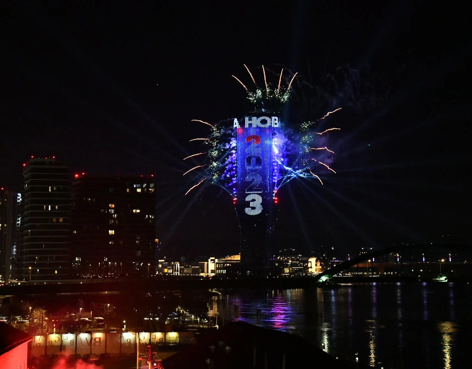 Tačno u ponoć, organizovan je vatromet, ali i spektakularni doček u Beogradu na vodi. Prštao je vatromet, a Kula Beograd zasijala je u bojama srpske trobojke sa brojem 2023.