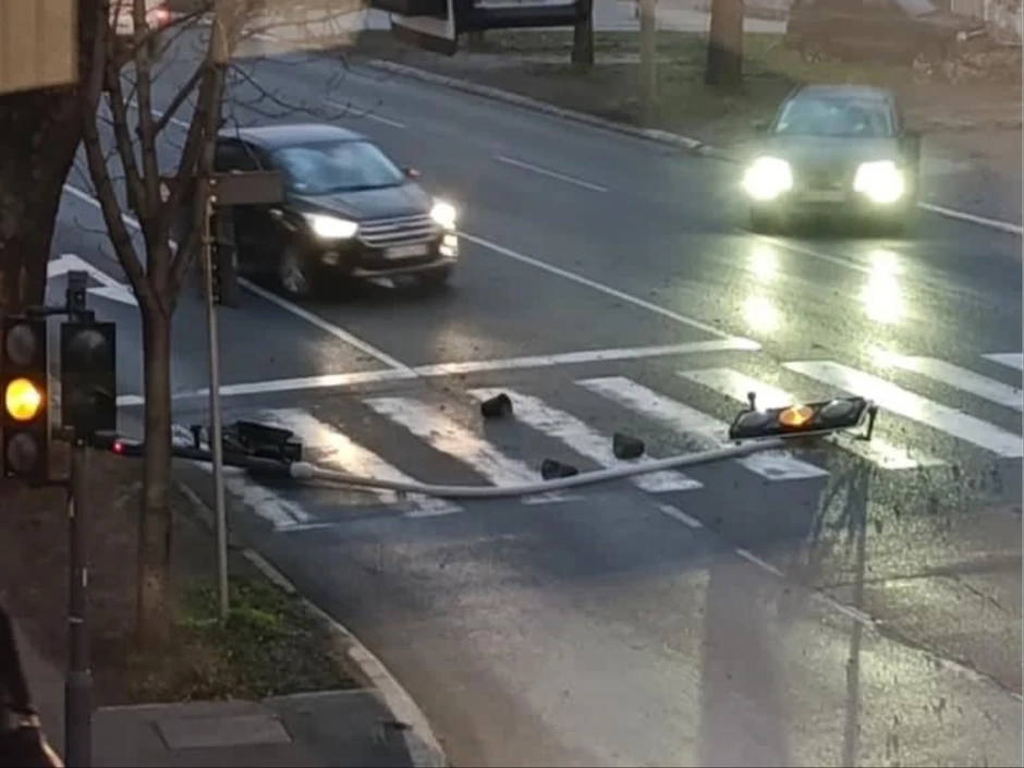 Na slici sa lica mesta može videti semafor koji se srušio bukvalno preko celog pešačkog prelaza, a pukom srećom niko nije povređen.
