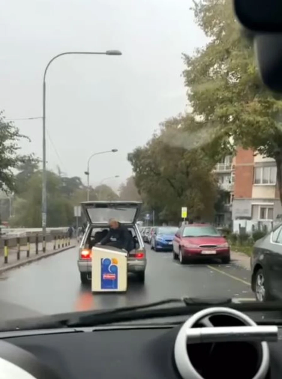 Naime, zamrzivač je trebalo preseliti, a vozilo nije dovoljno veliko da se on u njega ubaci, a kako ni krovni nosači nisu bili opcija, rešenje problema je bilo očigledno. Kako zamrzivač poseduje sopstvene točkiće, učesnik je seo u gepek automobila i kormilario zamrzivačem kroz gradske ulice!