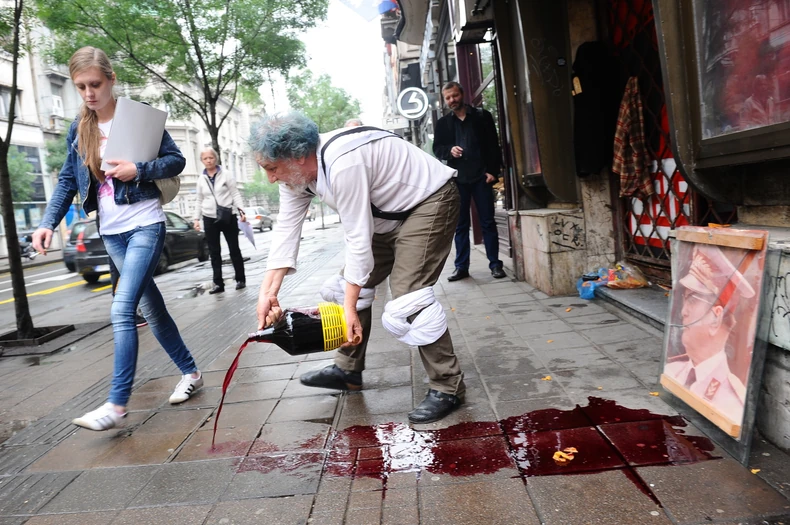 Slična Titova fotografija, koju je u ramu sa izlomljenim staklom zatekao u prostorijama „Zvezde“, poslužila mu je za performans koji je već u petak izveo pred ulazom u bioskop. Pred fotografijom je, nakon što je duvao balone u boji zlata i palio cigarete okupljenima „zlatnim“ upaljačem (kupljenim usput u kineskoj radnji), hteo da skrene pažnju na „zlatno doba“, a onda naočigled nekolicine zapanjenih prolaznika prosuo malo istarskog refoška praveći krvavocrven trag niz ulicu.