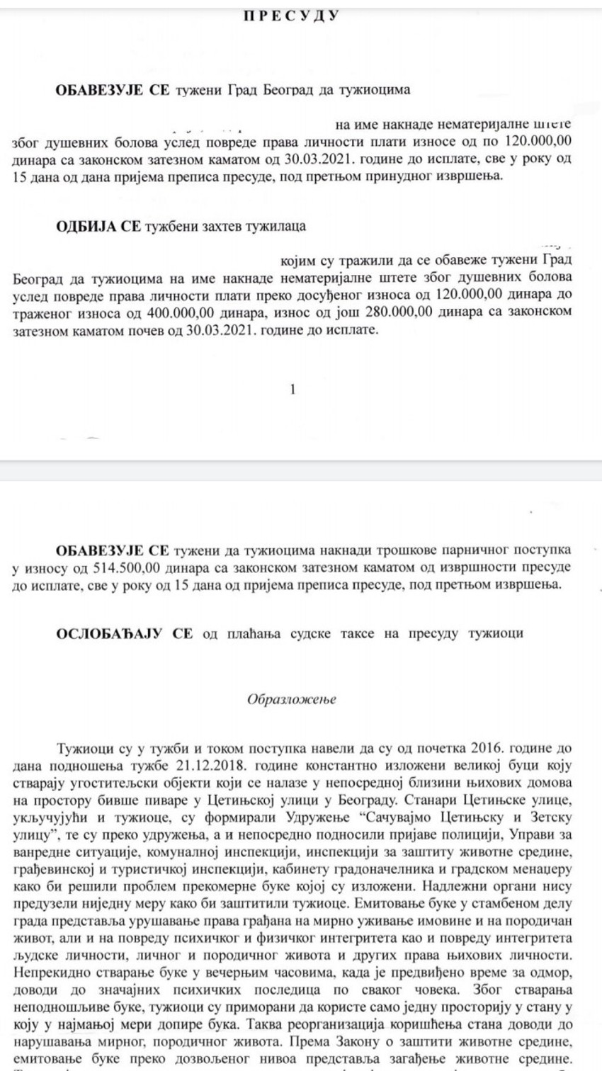 Inače, prema pesudi od kraja marta ove godine, Grad Beograd je u obavezi da stanarima isplati po 120.000 dinara "na ime nakandne nematerijalne štete zbog duševih bolova usled povrede prava ličnosti", navodi se u presudi.