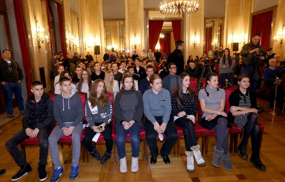 Gradski menadžer i osnivač Fondacije za mlade telente Beograda Goran Vesić, zamenica Skupštine grada Andrea Radulović i direktorka fondacije Ana Zekavica primili su danas u svečanoj sali Starog dvora prvu generaciju stipendista te fondacije.
