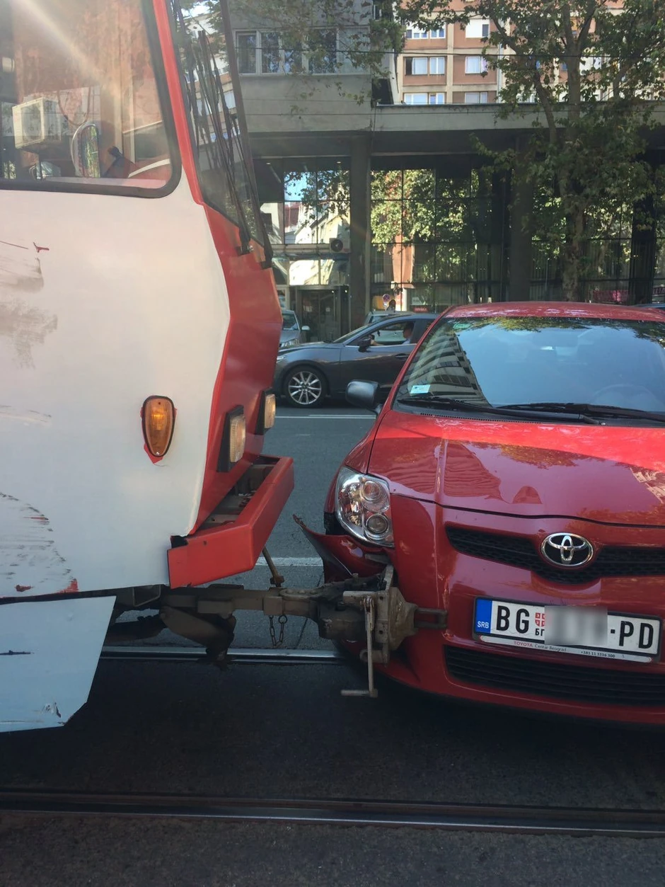 Putnički automobil i tramvaj koji saobraća na liniji pet sudarili su se na uglu Ulice 27. marta, danas oko 12.00 časova.