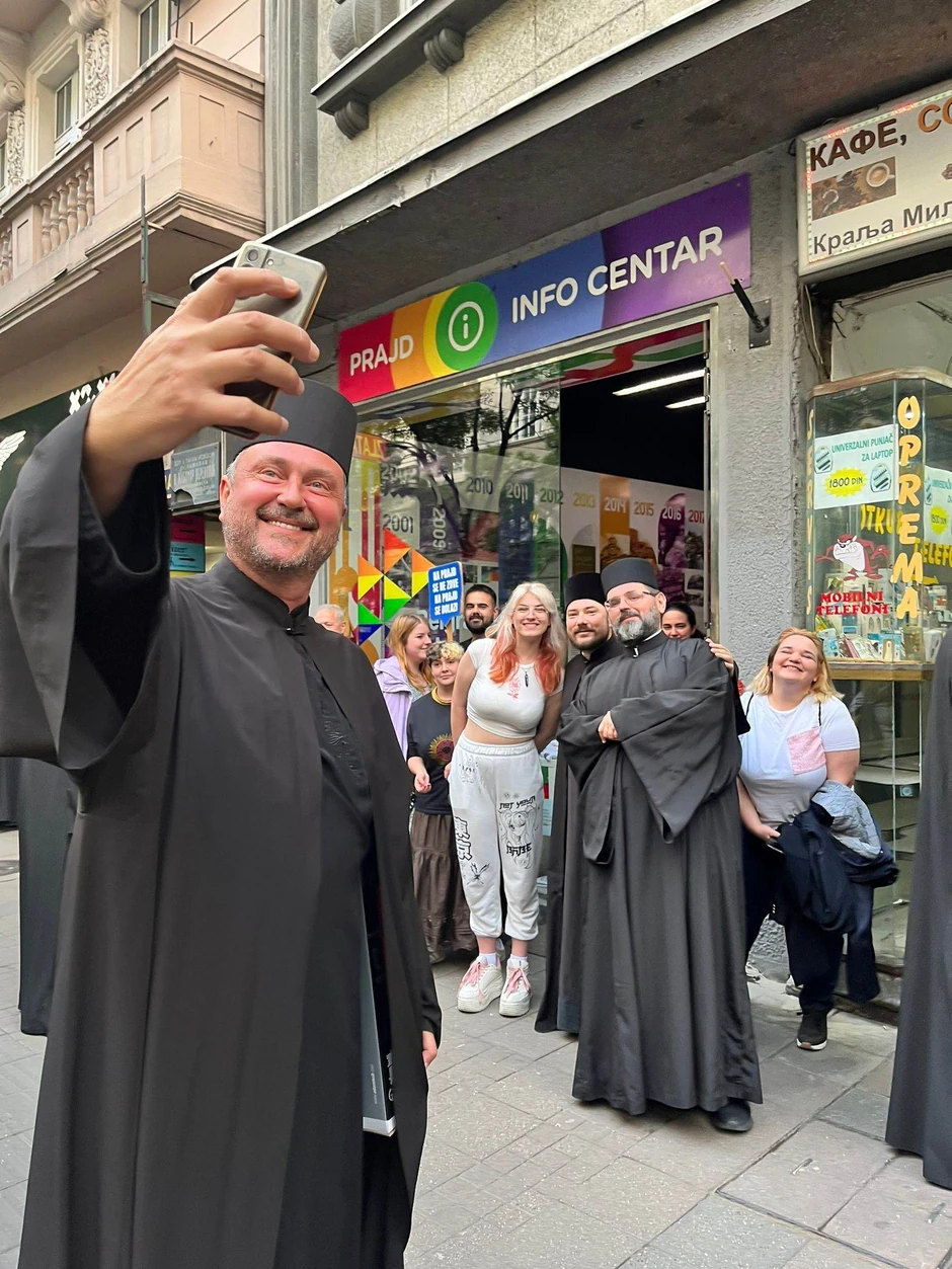 Društvenim mrežama od juče kruže fotografije nastale ispred Prajd info centra u Beogradu, na kojoj se vidi kako sveštenici prave selfi sa volonterima ovog centra.