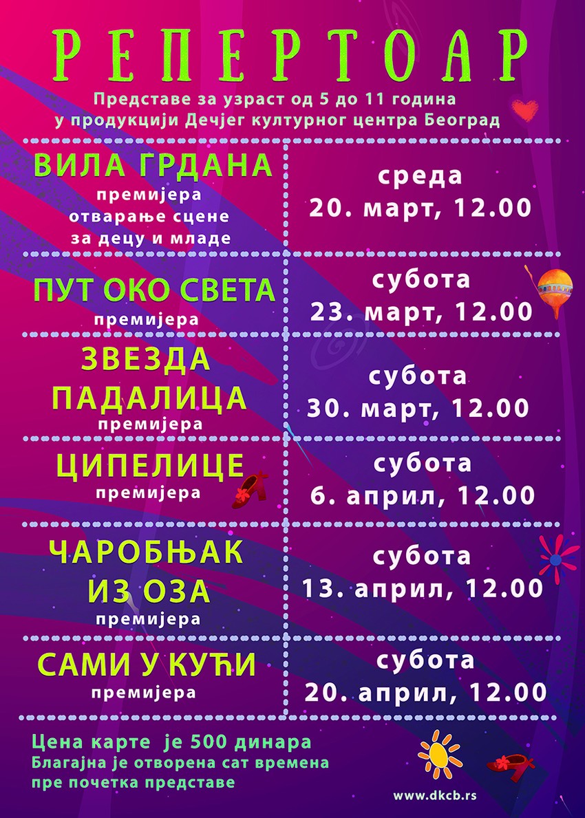 Na Svetski dan pozorišta za decu i mlade, 20. marta, u Dečjem kulturnim centru Beograd otvara se Scena za decu i mlade sa stalnim repertoarom. Prvi put u Beogradu, prvi put u Srbiji, u jednom pozorištu odigraće se šest premijera jedna za drugom, svake subote u 12 časova. Prestave su namenjene deci uzrasta od 5 do 11 godina.