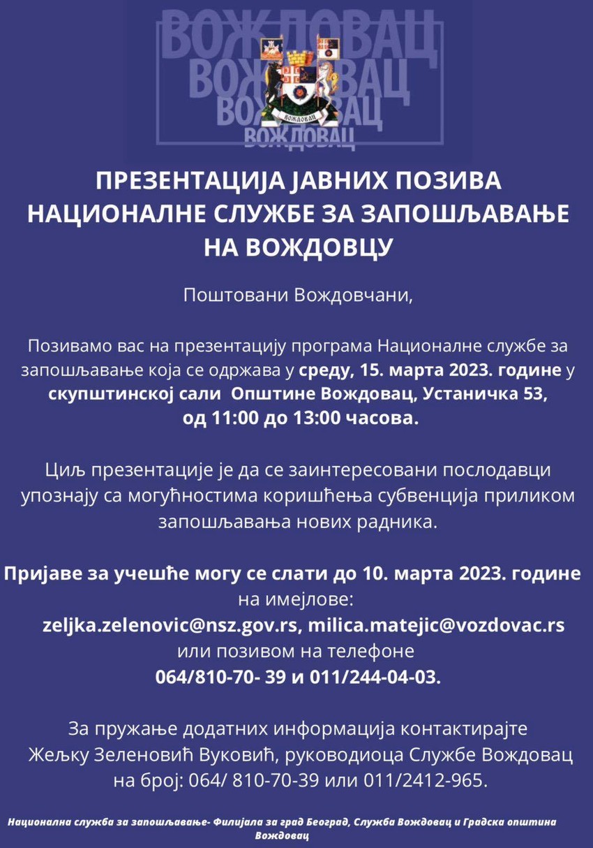 Nacionalna služba za zapošljavanje - Filijala za grad Beograd, Služba Voždovac i Gradska opština Voždovac organizuju prezentaciju programa NSZ koja se održava u sredu, 15. marta u skupštinskoj sali Opštine Voždovac, Ustanička 53, od 11 do 13 časova.