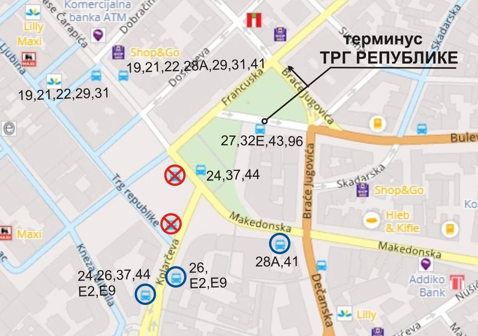 * u Kolarčevoj ulici su uspostavljena nova stajališta "Trg republike" u oba smera: ka Terazijama za autobuske linije 24, 26, 37 i 44, minibus linije E2 i E9, kao i noćne linije 26N, 29N, 31N, 33N, 37N, 47N, 48N i 51N;