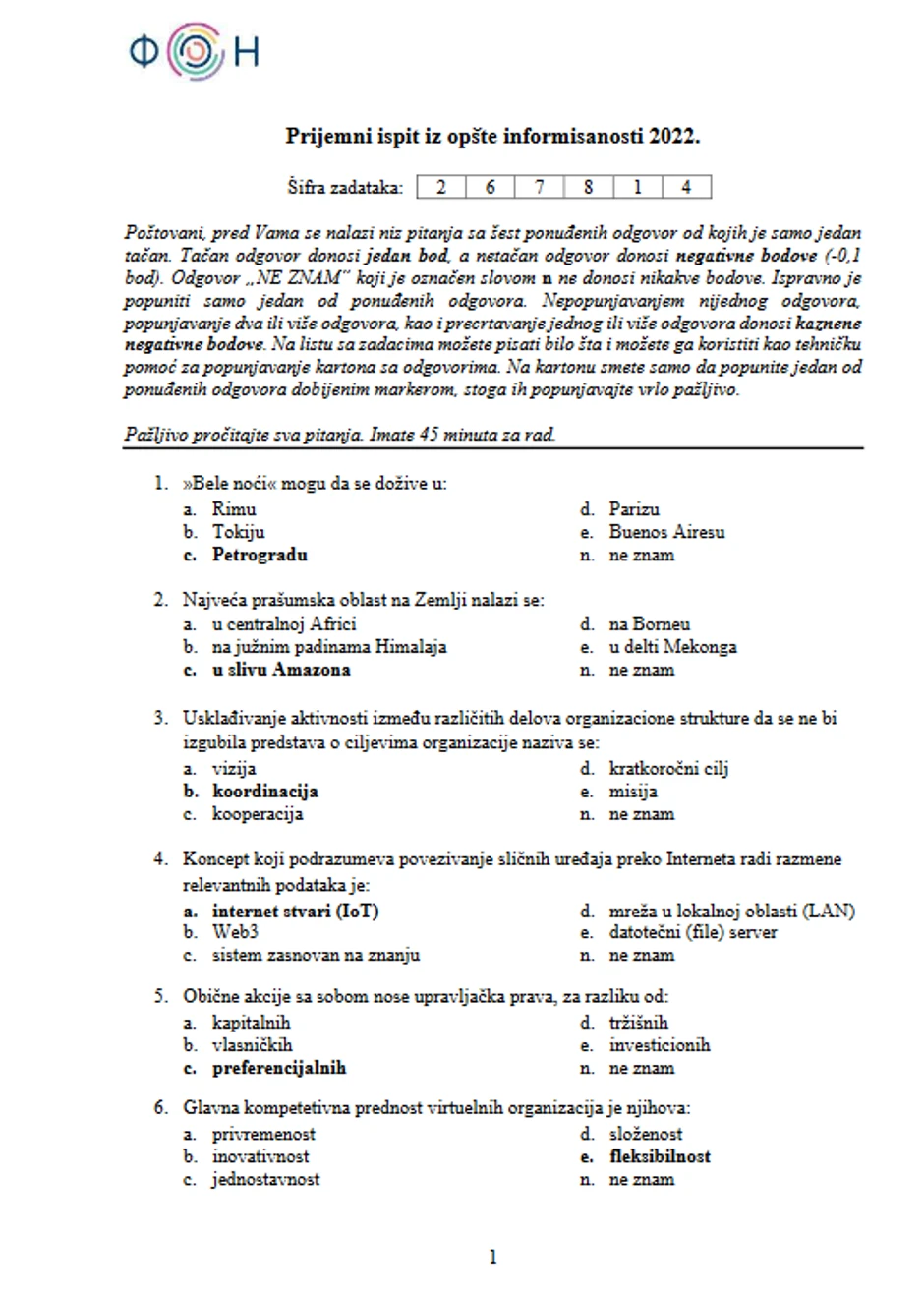 Osim matematike, budući studenti koji su se odlučili za Fakultet organizacionih nauka na prijemnom ispitu polagali su i opštu informisanost. Test se sastojao od 30 pitanja od kojih su sva bila na zaokruživanje.