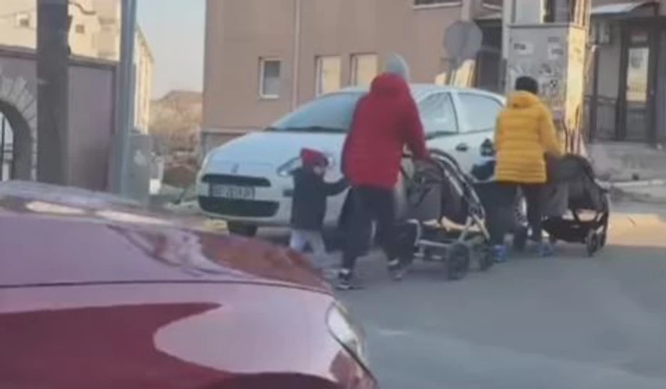 Majke se šetaju sa decom po kolovozu, dok su automobili parkirani na trotoaru