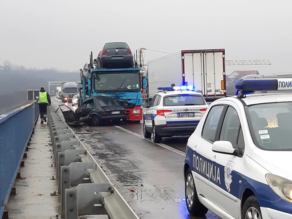 Pod još nerazjašnjenim okolnostima automobil je prosto podleteo pod šleper koji je prevozio nova vozila.