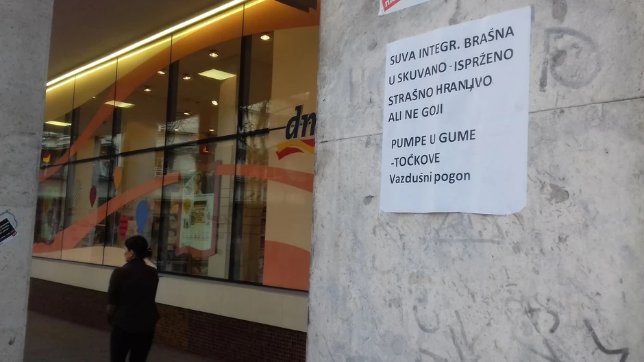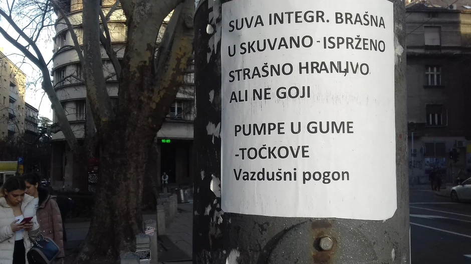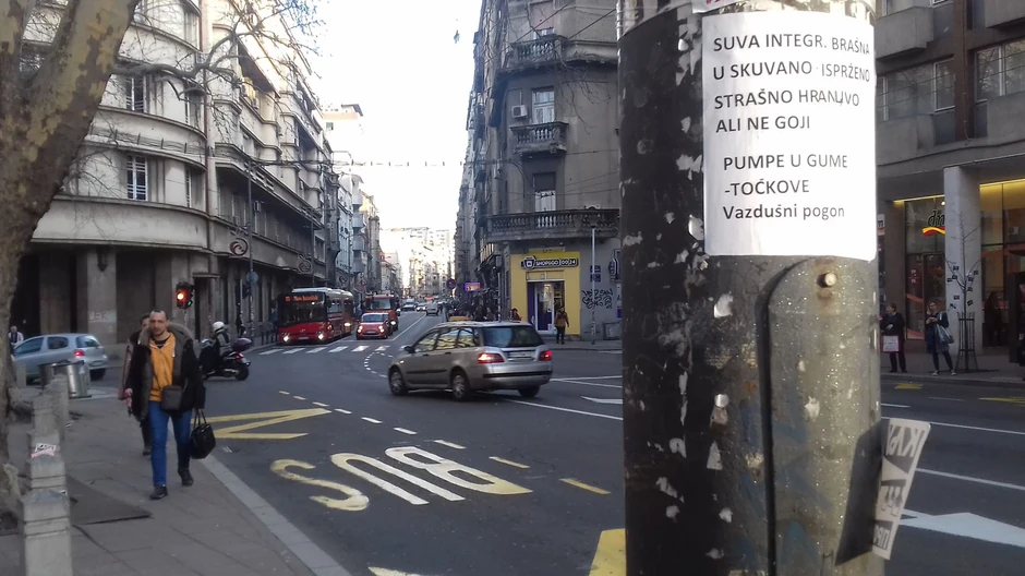 "Suvo integr. brašno u skuvano - isprženo strašno hranjivo ali ne goji. Pumpe u gume - točkove... Vazdušni pogon" glasi poruka ostavljena na banderama u ovoj starogradskoj ulici.