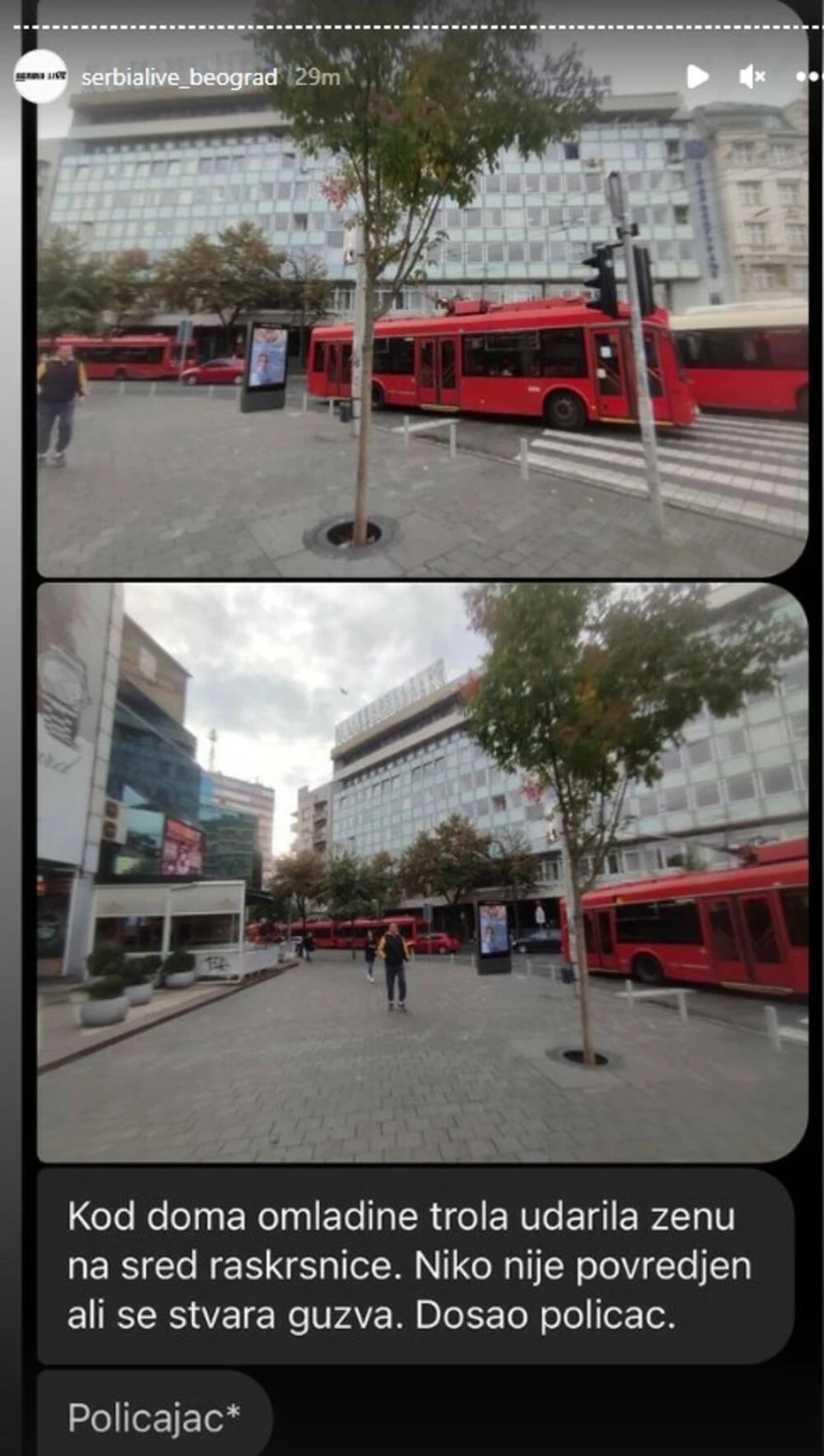 Kako prenosi Instagram stranica Serbialive, trolejbus je naleteo na ženu kod "Doma omladine", ali srećom žena nije teže povređena.