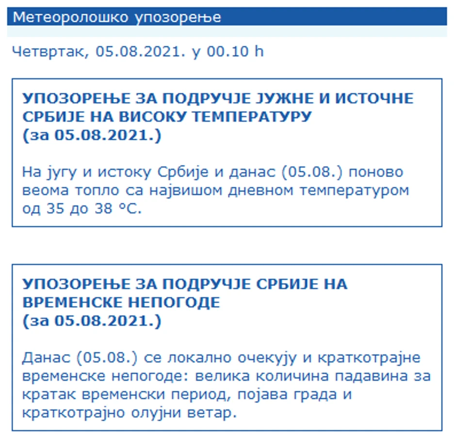 U pojedinim delovima grada moguće su kratkotrajne vremenske nepogode sa olujnim vetrom, pojavom grada i velikom količinom padavina za kratak vremenski period.