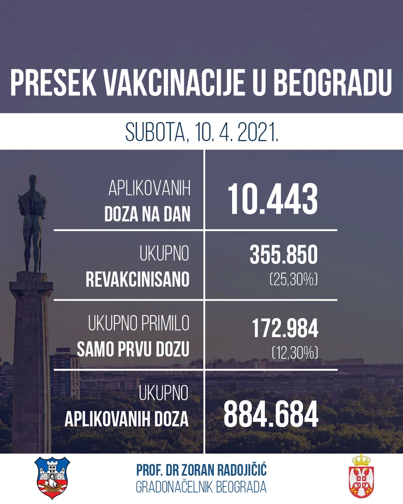 Gradonačelnik Beograda prof. dr Zoran Radojičić danas je na svojim društvenim mrežama objavio da ukupan broj vakcinisanih u Beogradu, u subotu, 10. aprila, iznosi 10.443, od čega je 8.662 vakcinisano prvi put, dok je revakcinisanih 1.781.