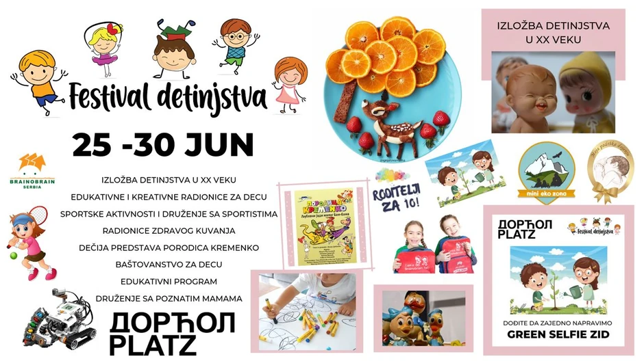 Prvo izdanje Festivala detinjstva biće održano od danas do 30. juna, od 10 od 20 časova u "Dorćol placu" (Dobračina 59b). Decu očekuje odlična zabava na brojnim sportskim i edukativnim radionicama, a roditelji će imati priliku da čuju puno korisnih saveta stručnjaka, ali i iskustva drugih roditelja.