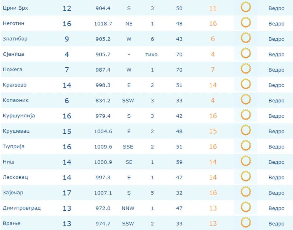 Odmah za njima nalaze se Novi Sad i Zaječar sa temperaturom od 17 stepeni. Ali, ne odmiču mnogo ni drugi gradovi u Srbiji, osim Požege i Sjenice gde je temperatura ispod 10 stepeni.