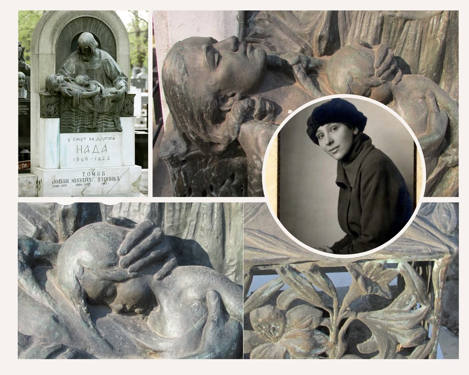 Na spomeniku od belog kamena stoji kratak natpis: "U SMRT ZA DRUGOGA" – NADA 1896-1922. Ovaj visoki reljef simbolične sadržine nalazi se na porodičnoj grobnici Tomić - Tomanić, a posvećen je Nadeždi Nadi Tomić, mladoj ženi koja je izgubila život u tamnim vodama Ženevskog jezera pokušavajući da pomogne malom davljeniku.