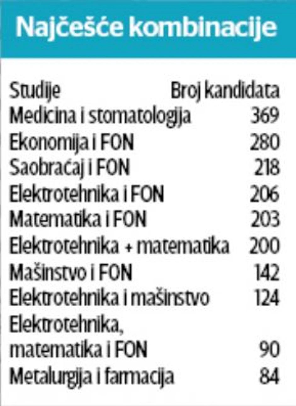 Kako bi povećali šanse da upišu željene studije, maturanti su konkurisali i na više od dva fakulteta: njih 90 se prijavilo za studije na ETF-u, Matematičkom i FON-u, a 16 je pored ova tri fakulteta apliciralo i na Mašinskom!