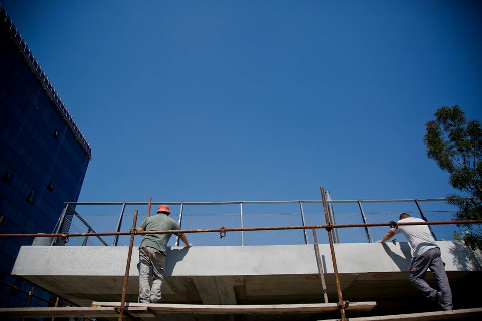 Sa strane koja gleda na Nemanjinu ulicu, radnici na skelama postavljaju sigurnosnu ogradu, dok njih nekoliko glača pločnik. Ipak, najviše njih je okupljeno oko postamenta na kom će se naći spomenik Dimitriju Tucoviću.