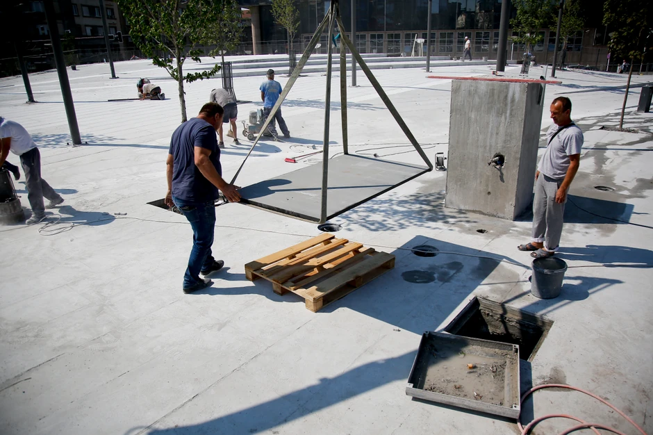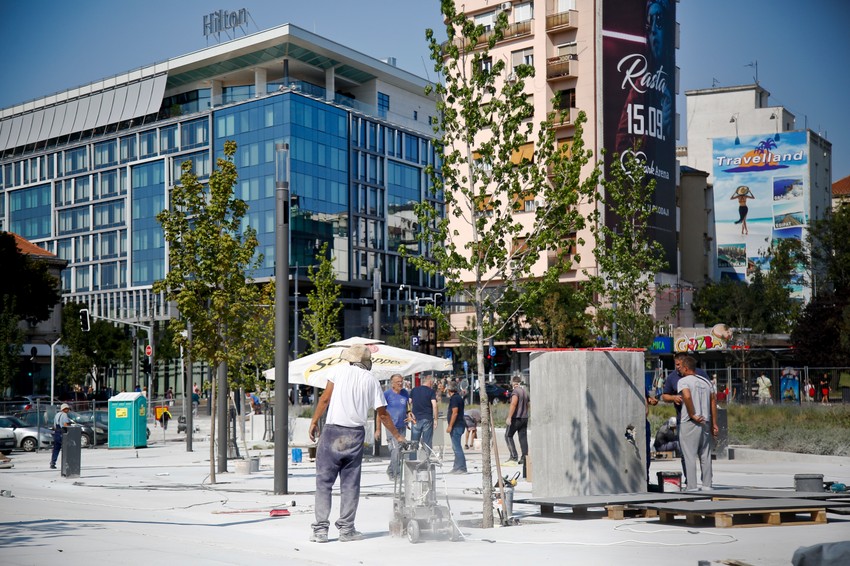 Danas znatno više radnika nego što je uobičajeno radi na uređenju ovog javnog prostora koji je nekada predstavljao ruglo grada. Bruse se ivičnjaci oko zelenih površina napravljeni od polimer-betona, veoma skupog materijala zbog kog je plato morao da bude rekonstruisan.
