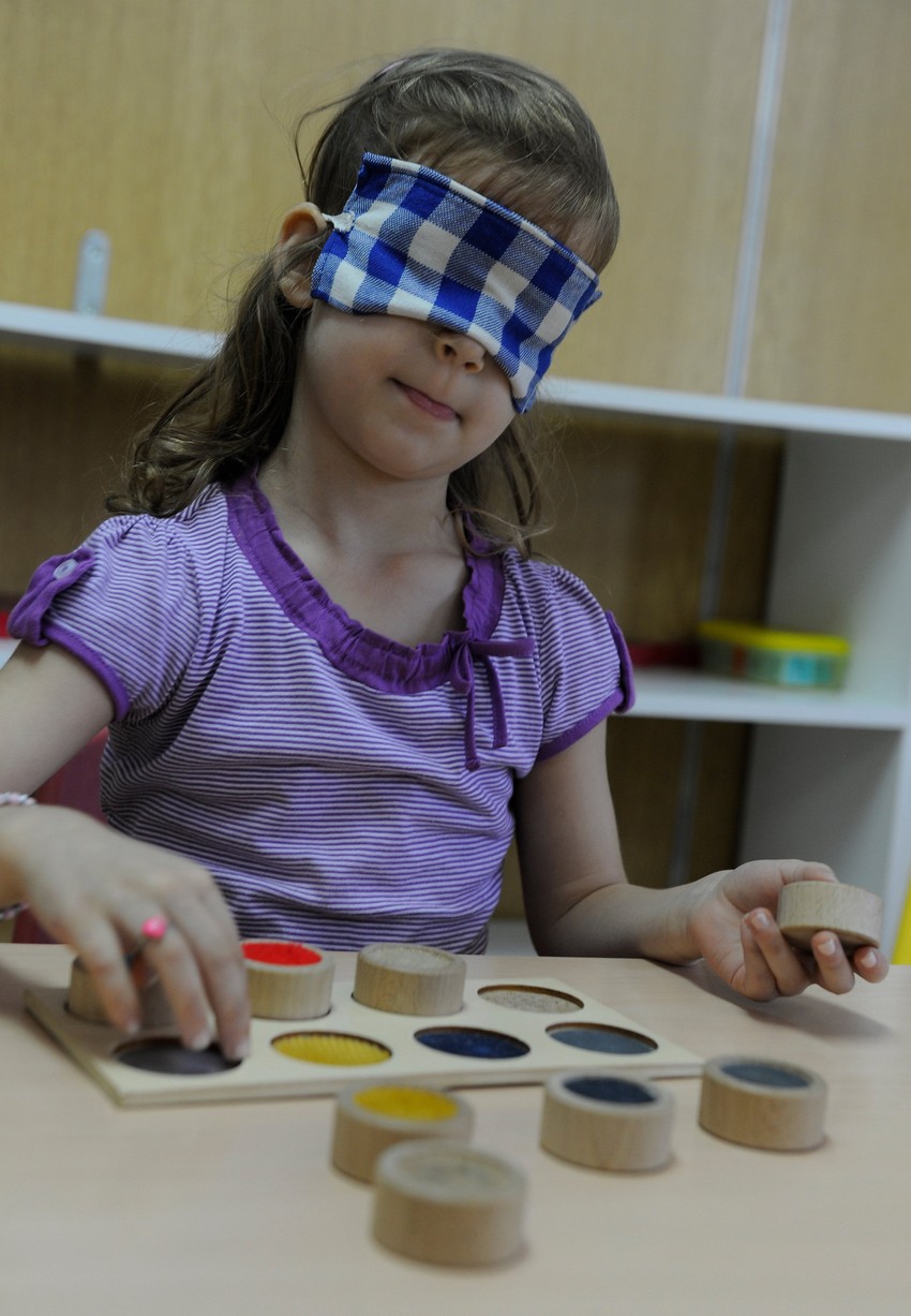- Na tacni sa grizom treba da napišem broj ili slovo koje izvučem. Onda protresem činiju da se izravna griz, pa pišem sledeći broj ili slovo – objašnjava šta radi Justin Ilić. Na ovaj način, on uči pisanje brojeva i slova, ali i „oslobađa“ ruku odnosno razvija grafo motoriku. Za susednim stolom, Sofija Milenković razvija čulo dodira. Sa povezom preko očiju, prstima jedne ruke opipava materijal na maloj ploči dok prstima druge ruke traži isti materijal na taktilnoj ploči… Kada im opadne koncentracija, deca vraćaju materijale na komodu i tako uče da sve ima svoje mesto.