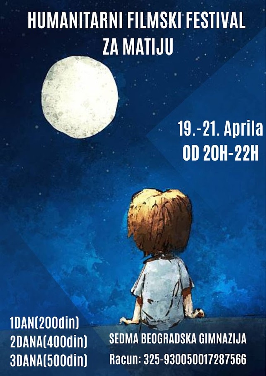 Učenici Sedme beogradske gimnazije organizuju humanitarni filmski festival koji će biti održan od 19. do 21. aprila. Tokom ova tri dana, u prostorijama gimnazije, biće postavljeno platno na kome će se sve tri večeri prikazivati po jedan film - dva domaća i jedan strani. Putem ove akcije, prikupljaće se humanitarna pomoć za bolesnog dečaka, Matiju Babića.