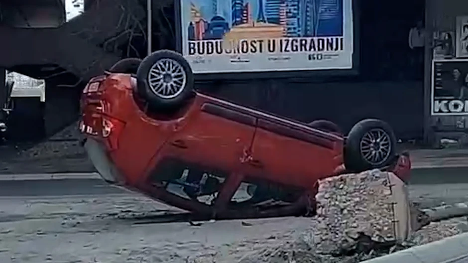 Kako se na pomenutom snimku vidi, automobil crvene boje leži prevrnut na krov, dok se pored njega nalazi i znak koji je izvaljen iz betone, a za koji se ne zna da li je tu već duže vreme ili je nastao prilikom udesa.