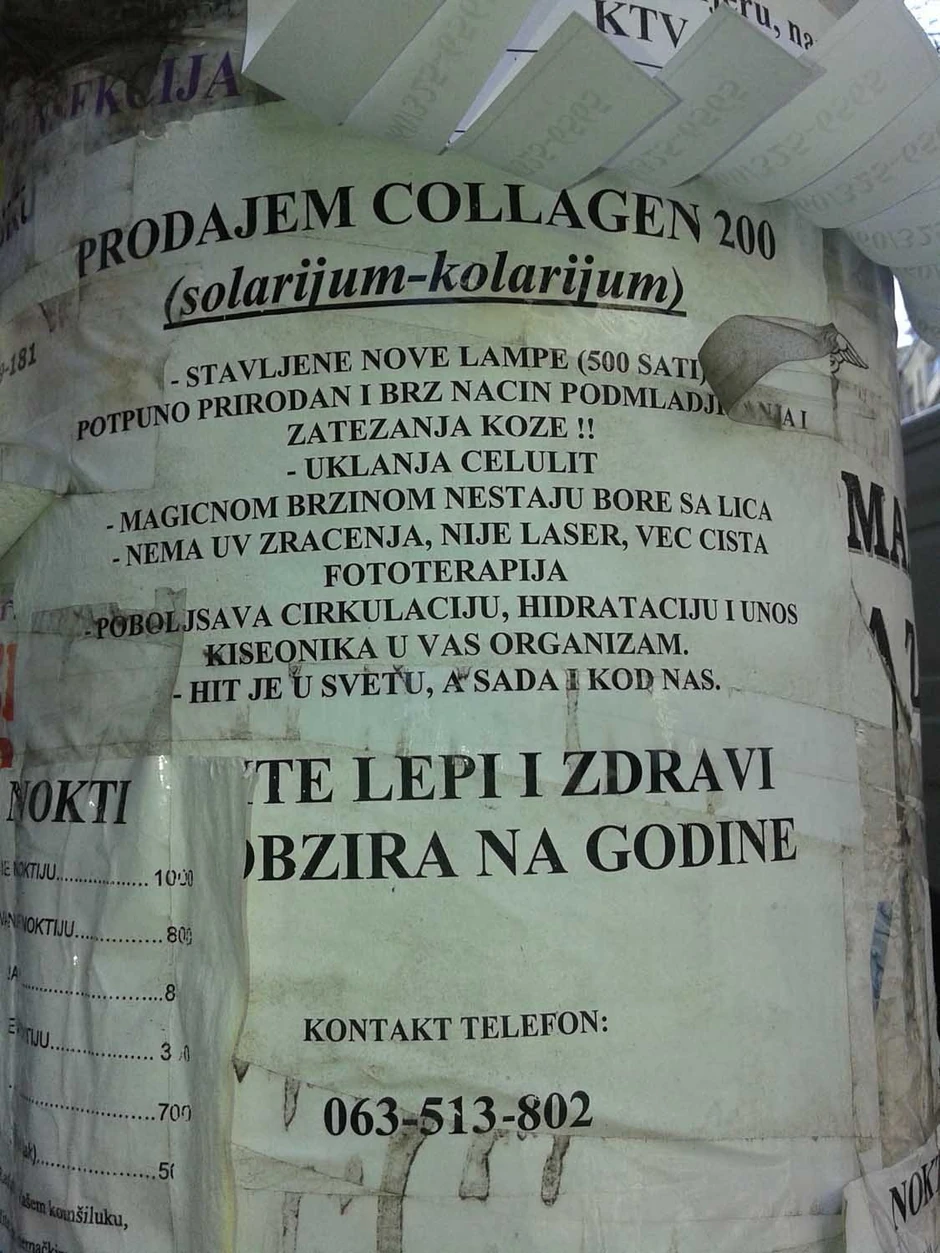 Pored “klasičnih”, po banderama se mogu naći i oglasi za otkup pirotskih ćilima, prodaju kolagena, kupovinu prirodne i farbane kose, kurs rekreativnog mečevanja i druge.