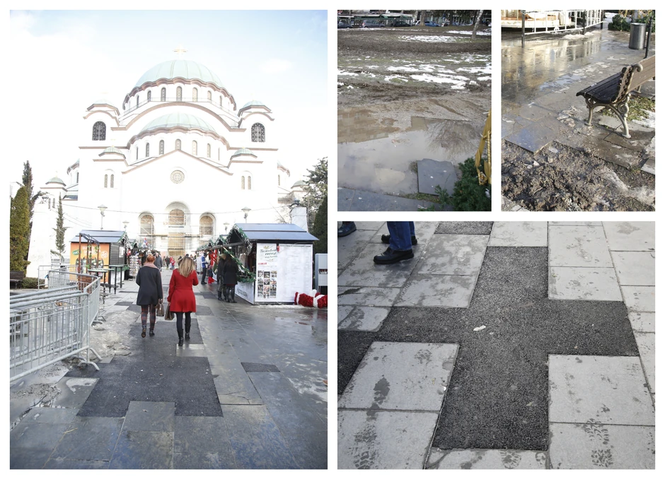 Polomljene ploče, kiša i sneg koji se skupljaju na razrovarenom šetalištu i nesigurni koraci prolaznika koji zapinju na neravnoj površini slika su platoa ispred Hrama Svetog Save već duže vreme. Rešenje za problem, kako se može videti ovih dana, ipak nije uvek postavka novih ploča ili kakvo saniranje starih već ni manje ni više no posipanje asfalta u nastale rupe.