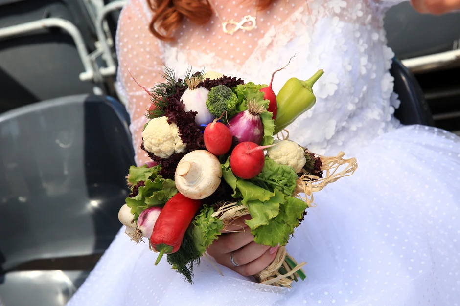 - Želela sam da našu, tradicionalnu srpsku baštu nosim sa sobom u najvažnijem danu u životu - kaže Željka Rodić Đumić (32) iz Beograda držeći svoj "salata" bidermajer, a na njemu luk, crni i beli, rotkvice, pečurke, paprika, a sve to uokvireno zelenom salatom.