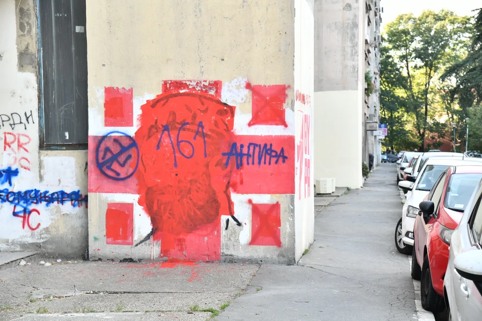 Preko farbe je plavom bojom nacrtan znak nacističke svastike koji je prekrižan. Preko lica Mihailovića je napisan broj 161 i odmah pored piše "Antifa", piše Telegraf.