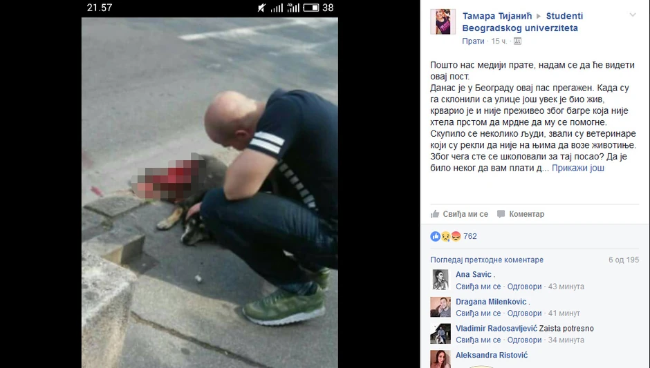 Objava u Fejsbuk grupi "Studenti beogradskog univerziteta" pokazuje bespomoćnu i teško povređenu životinju kako leži pokraj puta, na mestu gde ju je bahati i nesavesni vozač nakon udarca ostavio da iskrvari.
