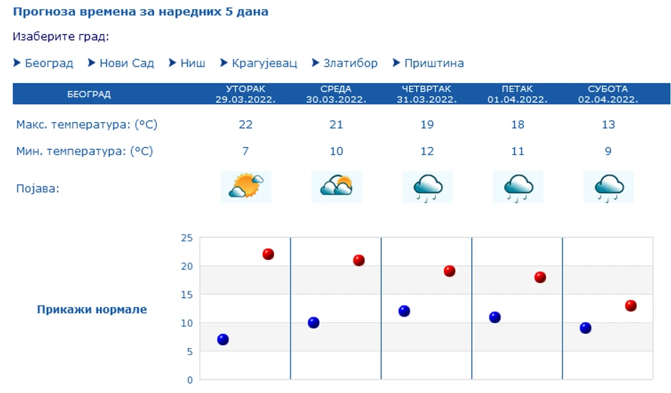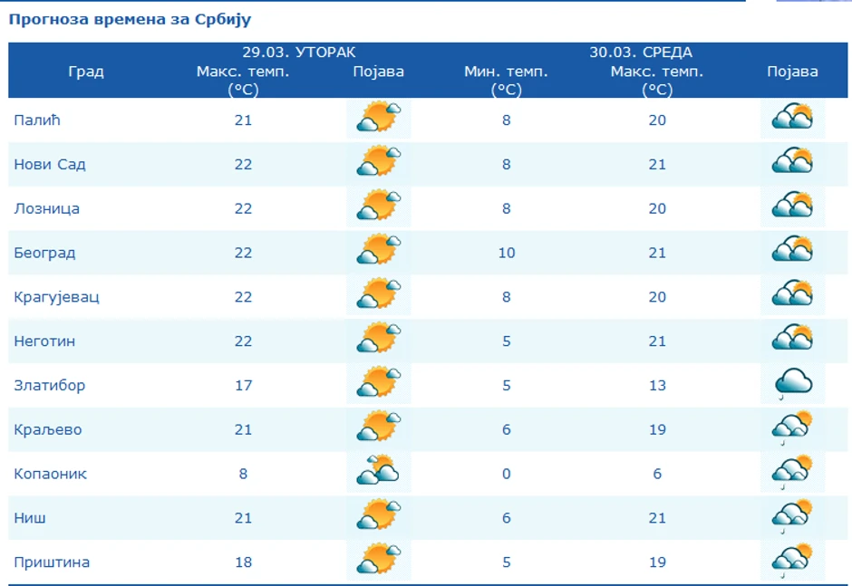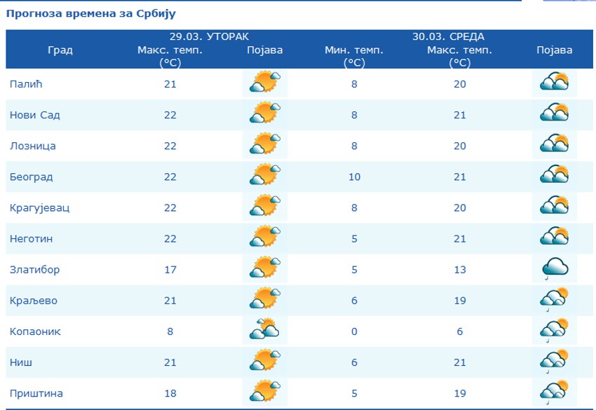 Najniza temperatura oko 7, najviša dnevna oko 22 stepena. Sutra postepeno naoblačenje, ponegde s kišom i lokalnim pljuskovima, više padavina se očekuje posle podne i uveče. Do kraja nedelje pretežno oblačno, mestimično sa kišom i pljuskovima, na visokim planinama i sa snegom, a temperatura će biti u postepenom padu. U četvrtak, petak i subotu se lokalno očekuju i obilnije padavine. U nedelju i ponedeljak hladno, ponegde sa snegom i u nižim predelima.