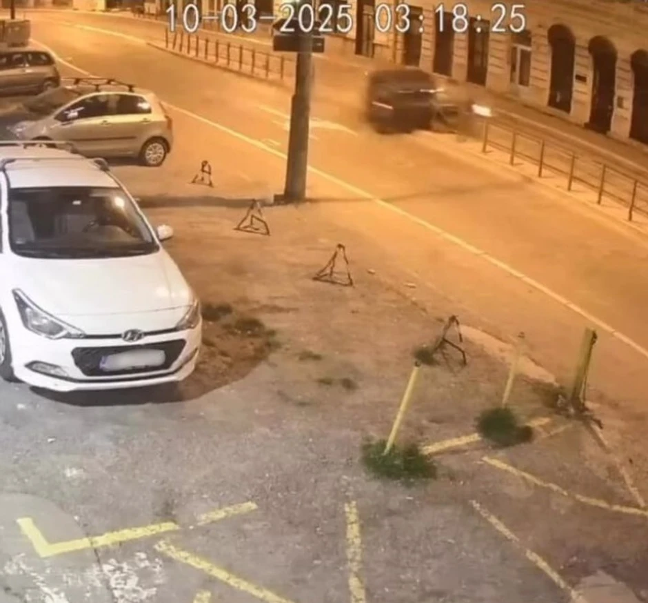 Na uznemirujućem snimku saobraćajne nezgode koji su zabeležile sigurnosne kamere vidi se kako je vozač crnog automobila izgubio kontrolu usled velike brzine, udario u zaštitnu tramvajsku ogradu, "pokosio" nekoliko stubića nakon čega se jedanput prevrnuo i završio sa strane - na "boku".