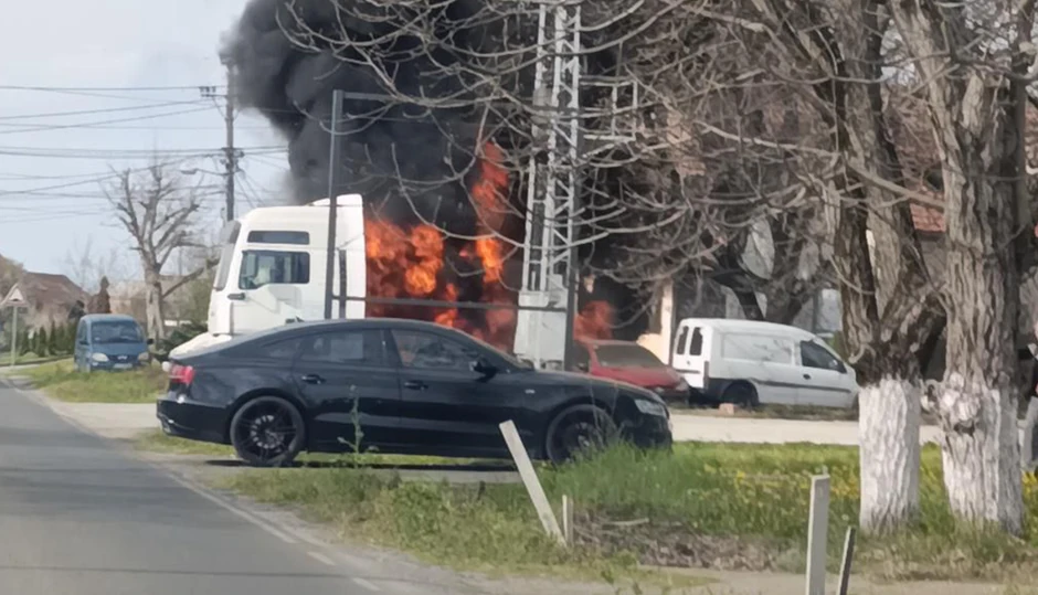 Kako se na snimku sa lica mesta može videti, plamen je progutao gotovo čitavu kabinu kamiona, a crni, gust dim prekrio je naselje.