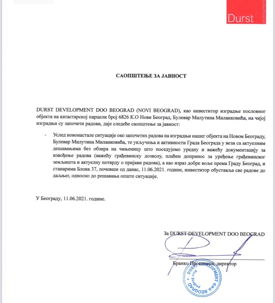 Austrijska kompanija „Durst”, investitor na placu u Bloku 37, prihvatila je moju molbu da obustavi radove na ovom placu, povuče mašine i radnike dok u razgovorima koje ću sa njima u ime Grada Beograda da vodim ne pronađemo najbolje rešenje za građane, Grad Beograd i samu kompaniju, rekao je zamenik gradonačelnika Goran Vesić gostujući u jutarnjem programu TV Studio B.