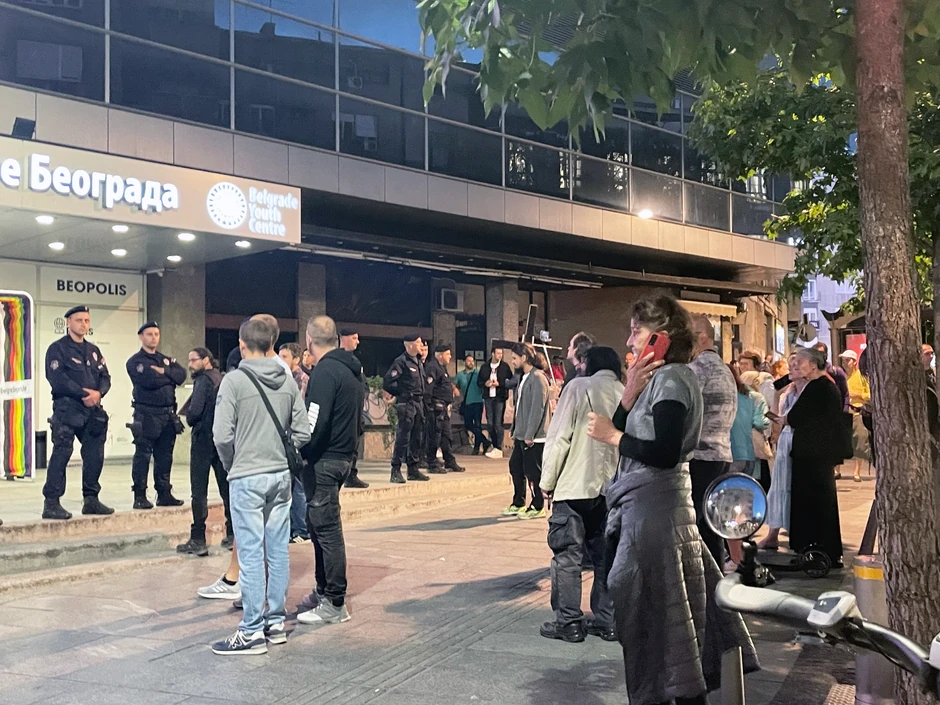 Ispred Doma omladine je trenutno više od 40 policajaca, javlja naša reporterka sa lica mesta. Oni čuvaju ulaz i staraju se da ne dođe do sukoba sa učesnicima i gostima na konferenciji o ljudskim pravima. Deo pripadnika organa reda je i oko Doma omladine.