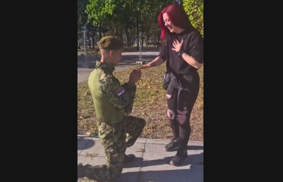 Mladi vojnik, još uvek obučen u uniformu Vojske Srbije, rešio je da iznenadi svoju izabranicu i iz uniforme izvuče prsten, klekne i zaprosi je naočigled prolaznika.