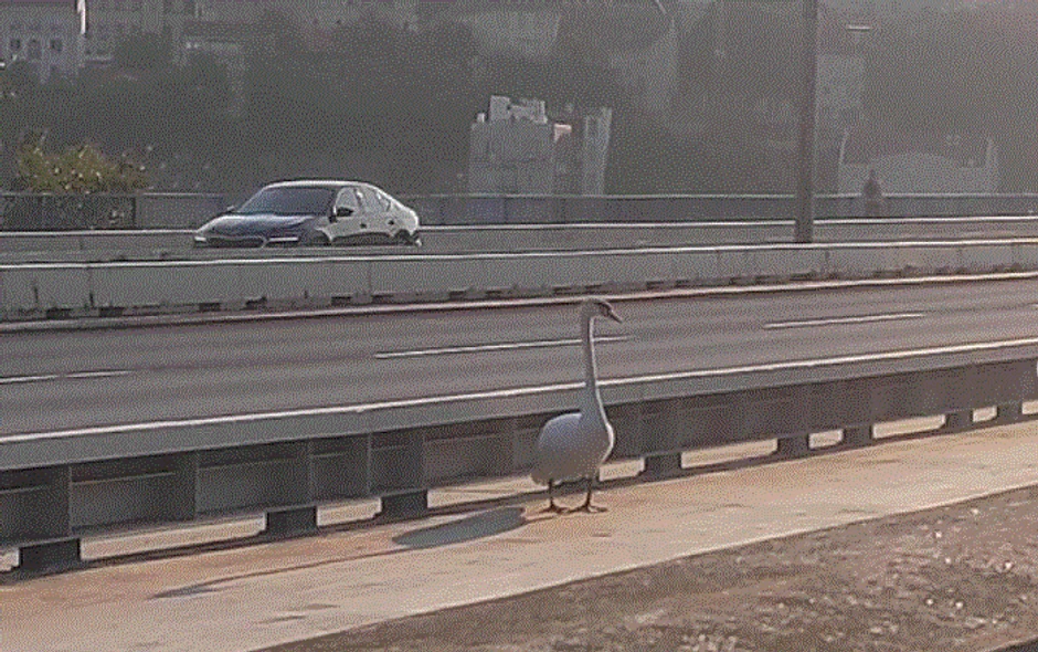 Međutim, jedan od ovih pernatih lepotana bio je možda jutros previše radoznao te se umesto da kako zakoni prirode nalažu pliva ispod mosta, zaputio peške - preko mosta. I to sam.