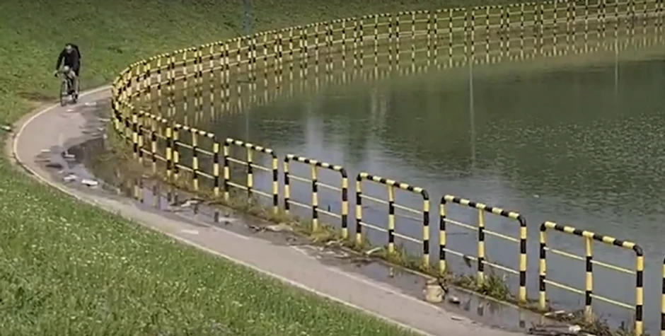 Na snimku je zabeleženo da se voda polako izliva na biciklističku stazu, ali još uvek je omogućeno kretanje bicikala.