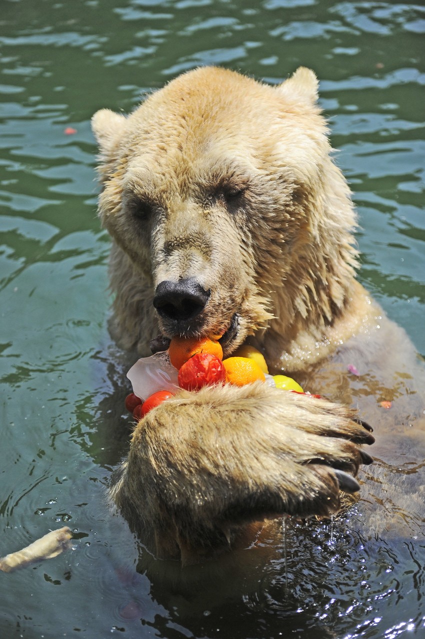 Kad su toliko visoke temperature, ovaj veliki beli medved najviše voli da pojede hladnu poslasticu - voće i ribe zaleđene u veliku kocku leda. Zadovoljno brunda dok polako gricka zaleđene poslastice...