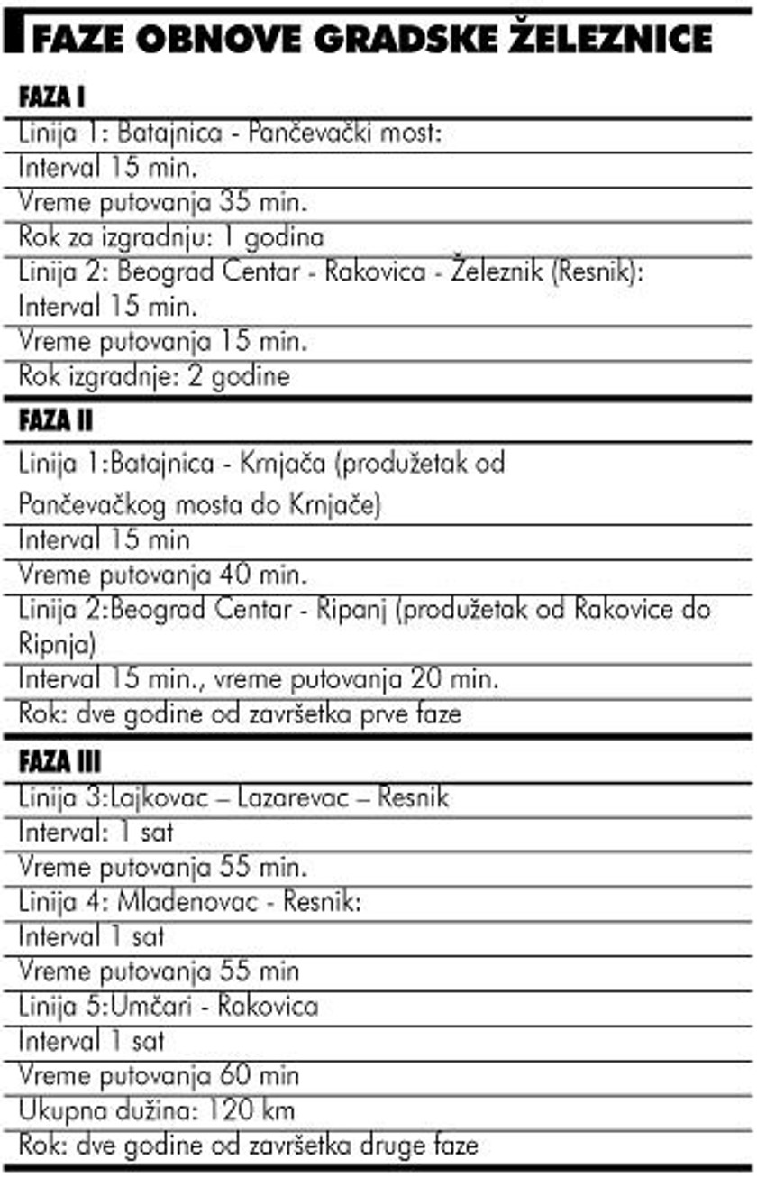 - U igri su četiri firme i mogu samo da kažem da one nisu poznate javnosti. Nijedna od njih za završetak posla nije ponudila duži rok od sedam meseci, što se poklapa sa našim planovima da "Beovoz" oživimo do polovine sledeće godine. Osim toga, do tada bi trebalo da bude završena rekonstrukcija levog banatskog koloseka u stanici "Beograd centar", kao i petog i šestog koloseka. Treći deo posla biće eliminacija laganih vožnji na relaciji od Pančevačkog mosta do Batajnice - kaže za "Blic" Dragan Stanković, direktor Sektora za prevoz putnika u "Železnicama Srbije" i dodaje da će najverovatnije rekonstrukcije pruga raditi građevinska operativa ovog preduzeća, uz finansijsku pomoć Grada.