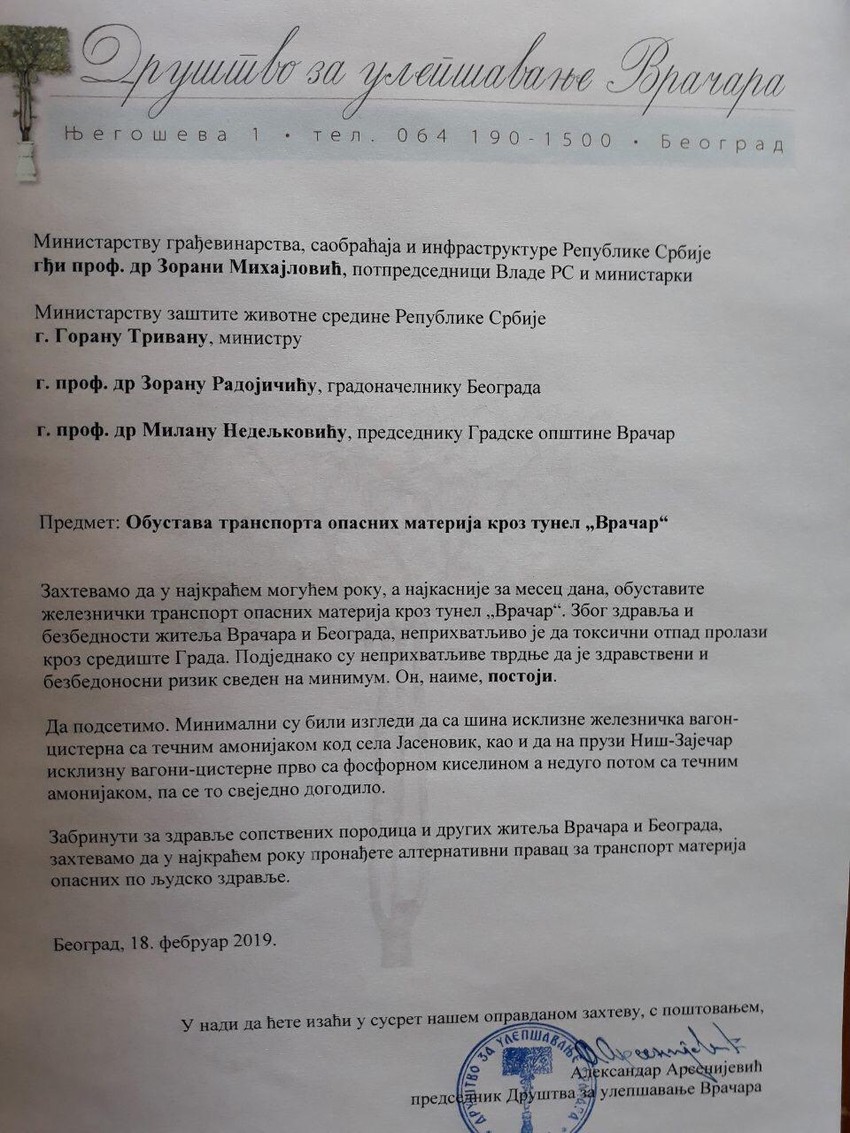 Društvo za ulepšavanje Vračara podnelo je zahtev kako bi se u najkraćem roku obustavio železnički transport opasnih materija kroz tunel "Vračar".