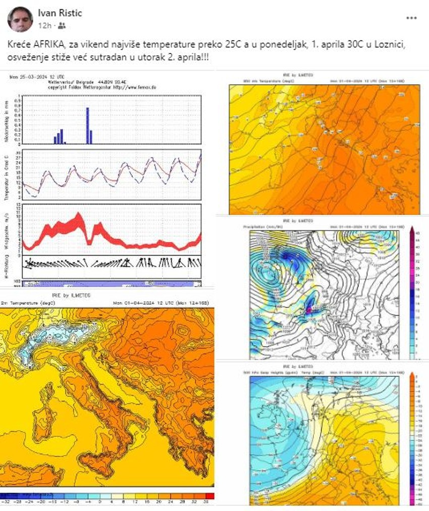 Prema vremenskoj prognozi Ivana Ristića, iz srca Afrike stiže nam temperatura i do 30 stepeni Celzijusa, koliko se očekuje da bude 1. aprila konkretno u Loznici, ali će biti toplo širom Srbije.