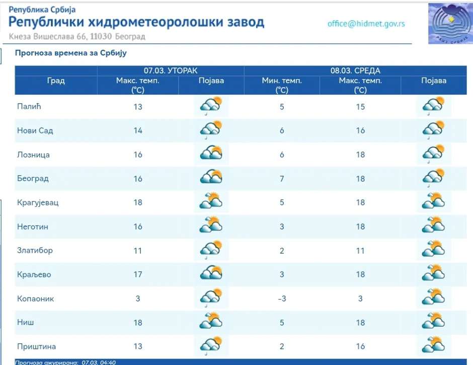Najniža temperatura od -1 do 6, a najviša od 13 do 18 stepeni. Vetar slab i umeren, južni i jugozapadni, krajem dana na planinama u pojačanju, saopštio je RHMZ.