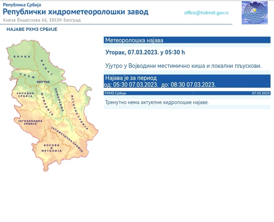 Lokalna pojava kratkotrajne kiše ili pljuska u Vojvodini se očekuje već ujutro i prepodne, dok će posle podne kratkotrajne kiše, osim na severu, uz lokalni razvoj oblačnosti ponegde biti i u ostalim krajevima.