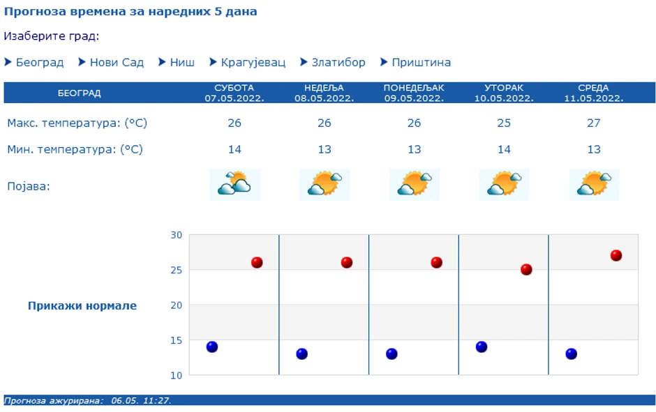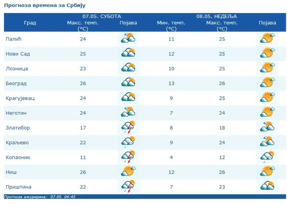 Vetar umeren, povremeno jak jugoistočni. Najniža temperatura oko 14 °C, a najviša oko 26 °C. U narednih sedam dana u Srbiji se očekuje toplo, u većini mesta pretežno sunčano vreme.