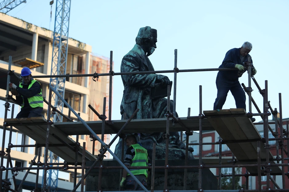 Stručnjaci Zavoda za zaštitu spomenika kulture Grada Beograda oko monumenta reformatora srpskog postavili su skele i zaštitnu mrežu, a radnici su juče skidali dotrajale i popucale ploče sa postamenta.