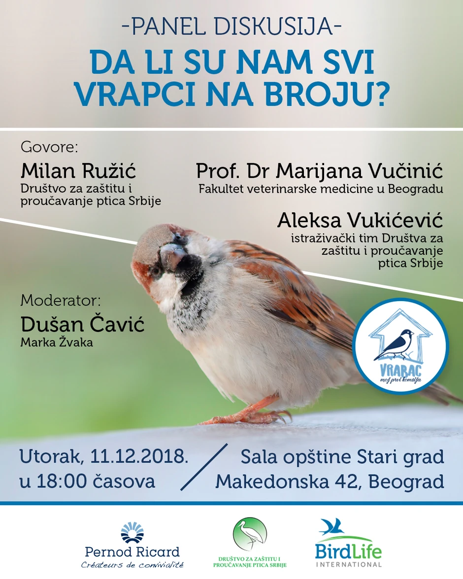 Stručnjaci iz Društva za zaštitu i proučavanje ptica Srbije održali su i predavanje "Urbane zelene površine" na Šumarskom fakultetu sa temom kako se one mogu unaprediti, a na panelu "Da li su nam svi vrapci na broju?" u opštini Stari grad danas je bilo predviđeno da ornitolozi predstave svoja istraživanja o problemima vrabaca i načinima na koje može da im se pomogne.